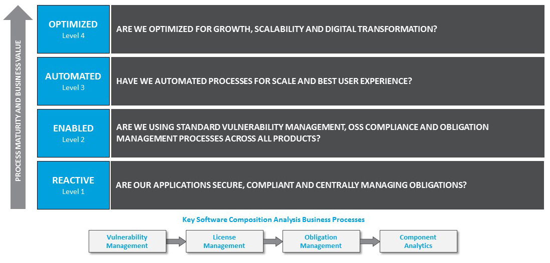To help legal, security and development teams and leaders identify their existing gaps and direct future investment, Revenera developed a maturity model framework based on an analysis of our customers and the market.